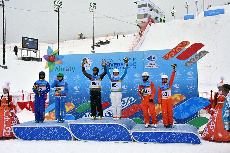 ALMATY – Yesterday, 30 and today, 31 January, the Aerials competition took place at the Tabagan Ski Resort, just outside Almaty. For the first time a ‘Mixed Team’ competition took place at the Winter Universiade. Six teams from four countries (BLR, CHN, KAZ & RUS) took part in the event. Each team was comprised of one male and one female jumper. The medal podium is as follows: