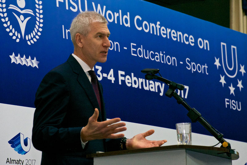 The FISU World Conference on Innovation – Education – Sport would like to provide an excellent opportunity to exchange scientific results and to compare ideas, projects and knowledge. It has been designed to reflect and discuss relevant topics and problems of sport in general but especially of university sport. The subthemes of the Conference refer to main topics and related problems which are in the focus of sport science and our societies but also in the focus of FISU and the international university sport movement today and in the future. Therefore I wish you not only a pleasant stay at the FISU World Conference and at the Winter Universiade in Almaty but also fruitful and inspiring discussions”.
