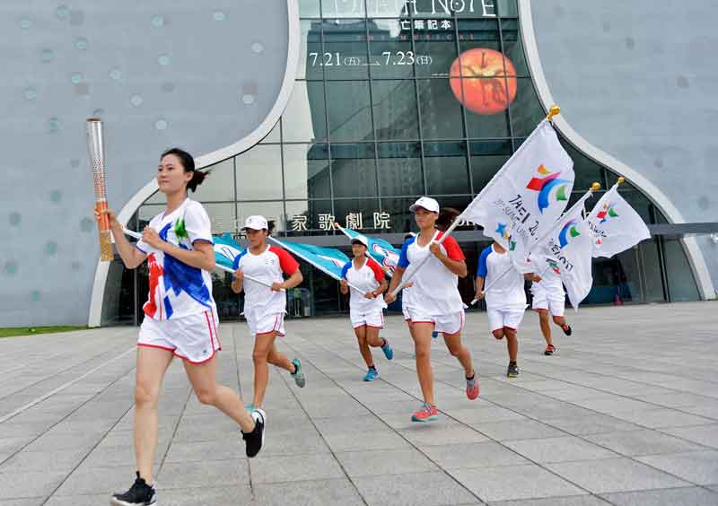 Torchbearer Yi Xuan Zeng, the taekwondo gold medalist at the 2007 Bangkok Universiade and the 2009 Belgrade Universiade, carries the flame past the iconic National Taichung Theatre before the 2017 Taipei Summer Universiade