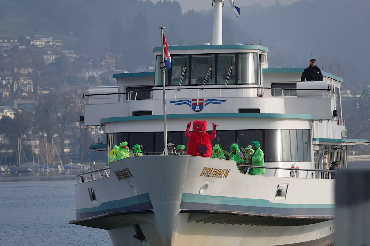 The Lucerne 2021 mascot designer Luisa Zürcher (centre)The mascot arrived by boat, dancing to the tune of a traditional ‘Kugel’ band that accompanied it. It was immediately clear that the personality of this mascot is its strongest characteristic, as it danced, played pranks on gathered spectators and generally lifted the mood drastically on a cold weekday morning.