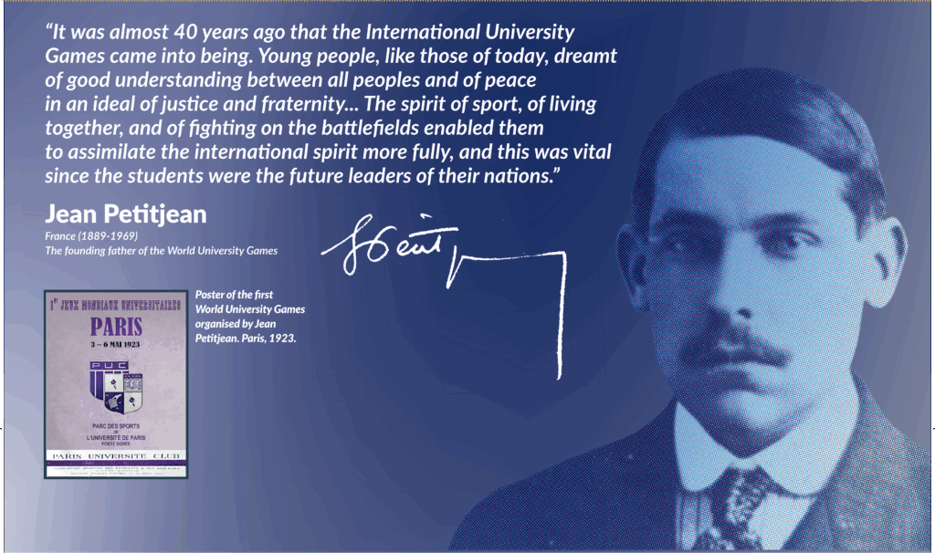 It was the Frenchman Jean Petitjean, chemistry engineer and university sports leader, who launched the first World University Games in 1923 in Paris. The International Confederation of Students founded in 1919 took the responsibility of organising several editions of Summer and Winter Games from 1924 to 1939. These biannual student competitions made a trip around Europe before being interrupted by the Second World War.