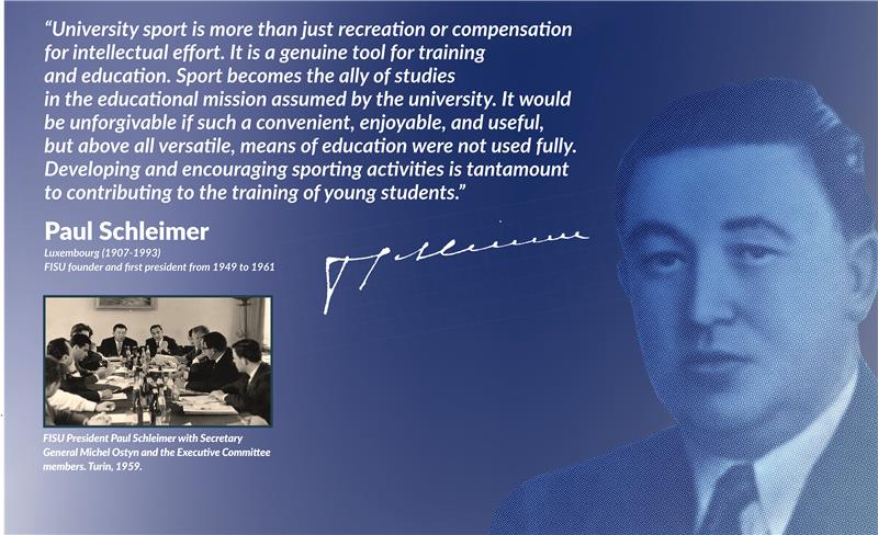 Luxembourg mathematician and teacher, Paul Schleimer, led the emerging Western group, and after long discussions started in 1948, the International University Sports Federation – or Fédération Internationale du Sport Universitaire in French (FISU) – was born. The organisation held its constitutive General Assembly on 1st June 1949.